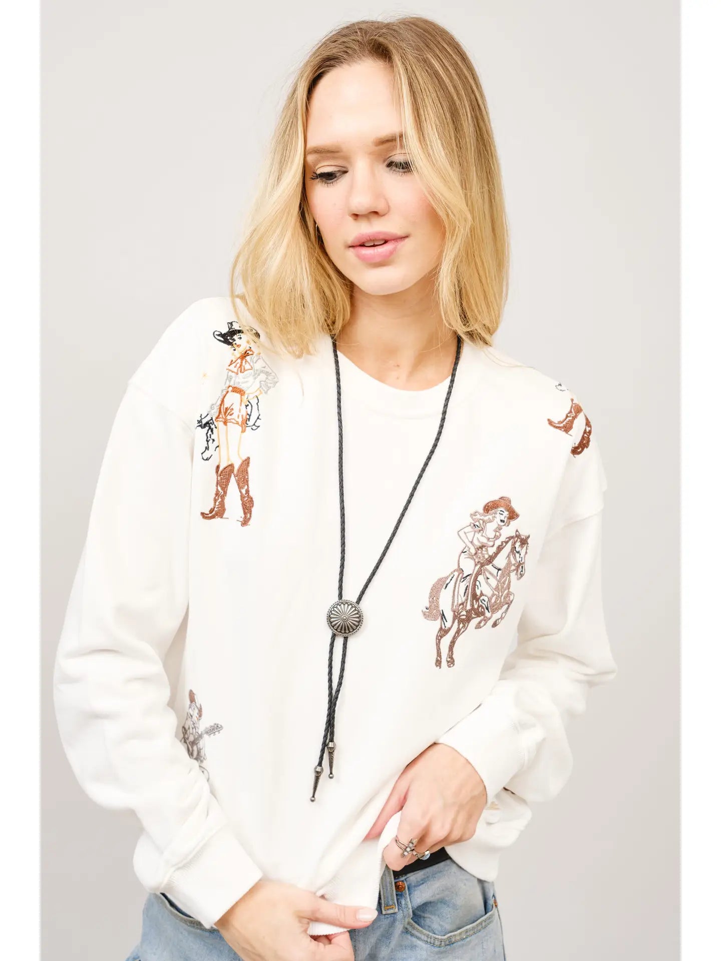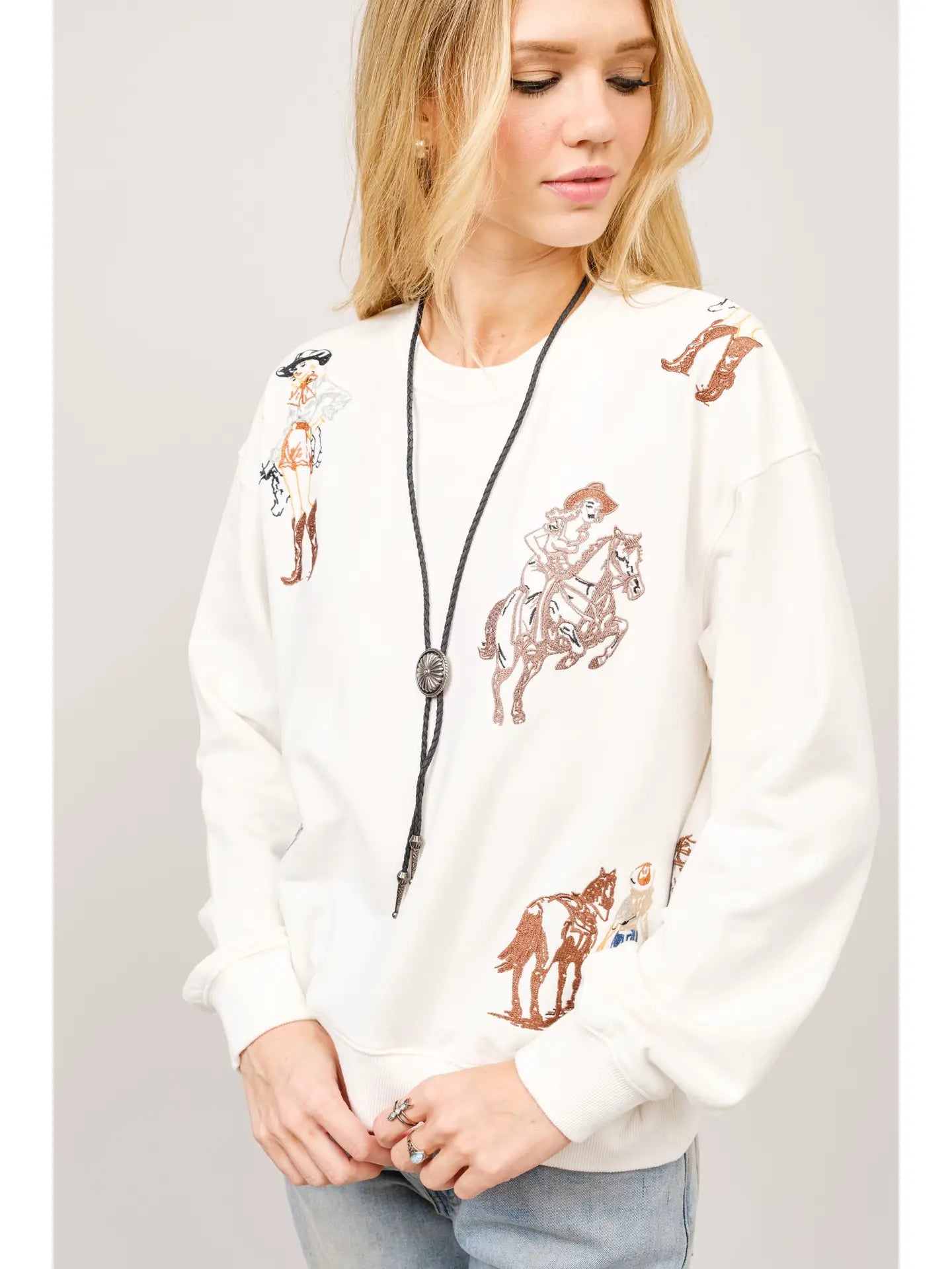 This elegant sweatshirt showcases a carefully embroidered Western motif, combining classic design elements with modern craftsmanship. Made from a premium blend of 85% cotton and 15% polyester, it promises exceptional softness and durability, making it an ideal choice for both comfort and style throughout your day. Its versatile fit complements various outfits, while the detailed graphic adds a subtle touch of rugged sophistication. Perfect for casual outings or relaxed settings, this piece strikes a refined balance between timeless appeal and everyday practicality. The model is 5'8" and wears a size Small.