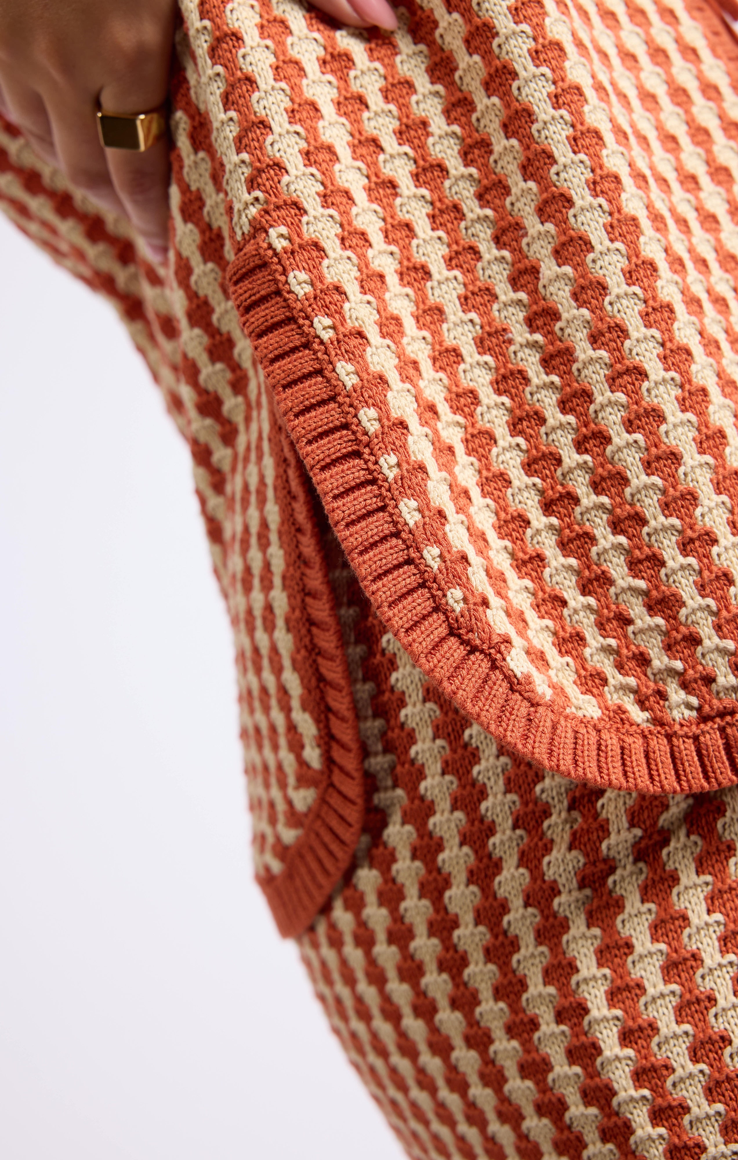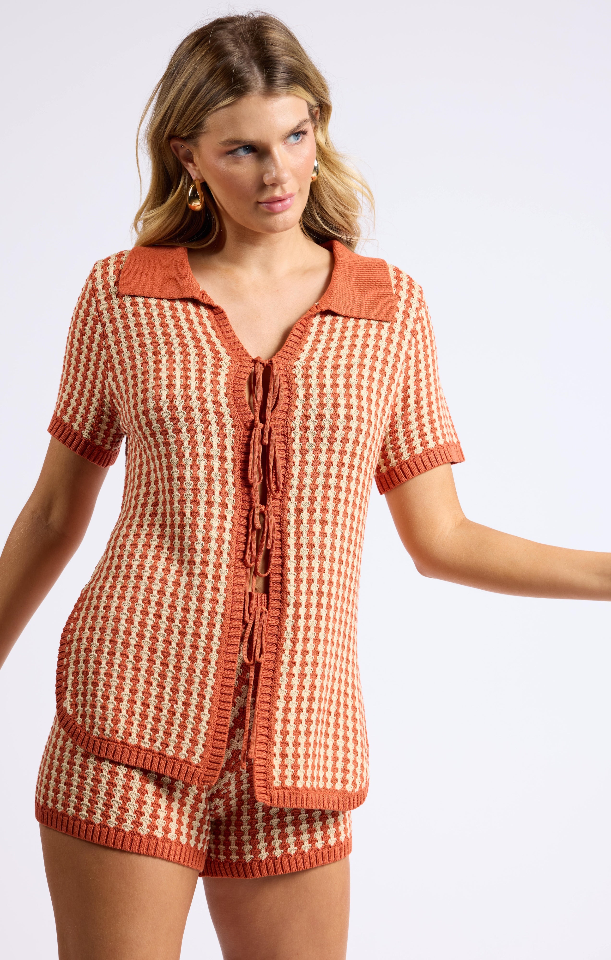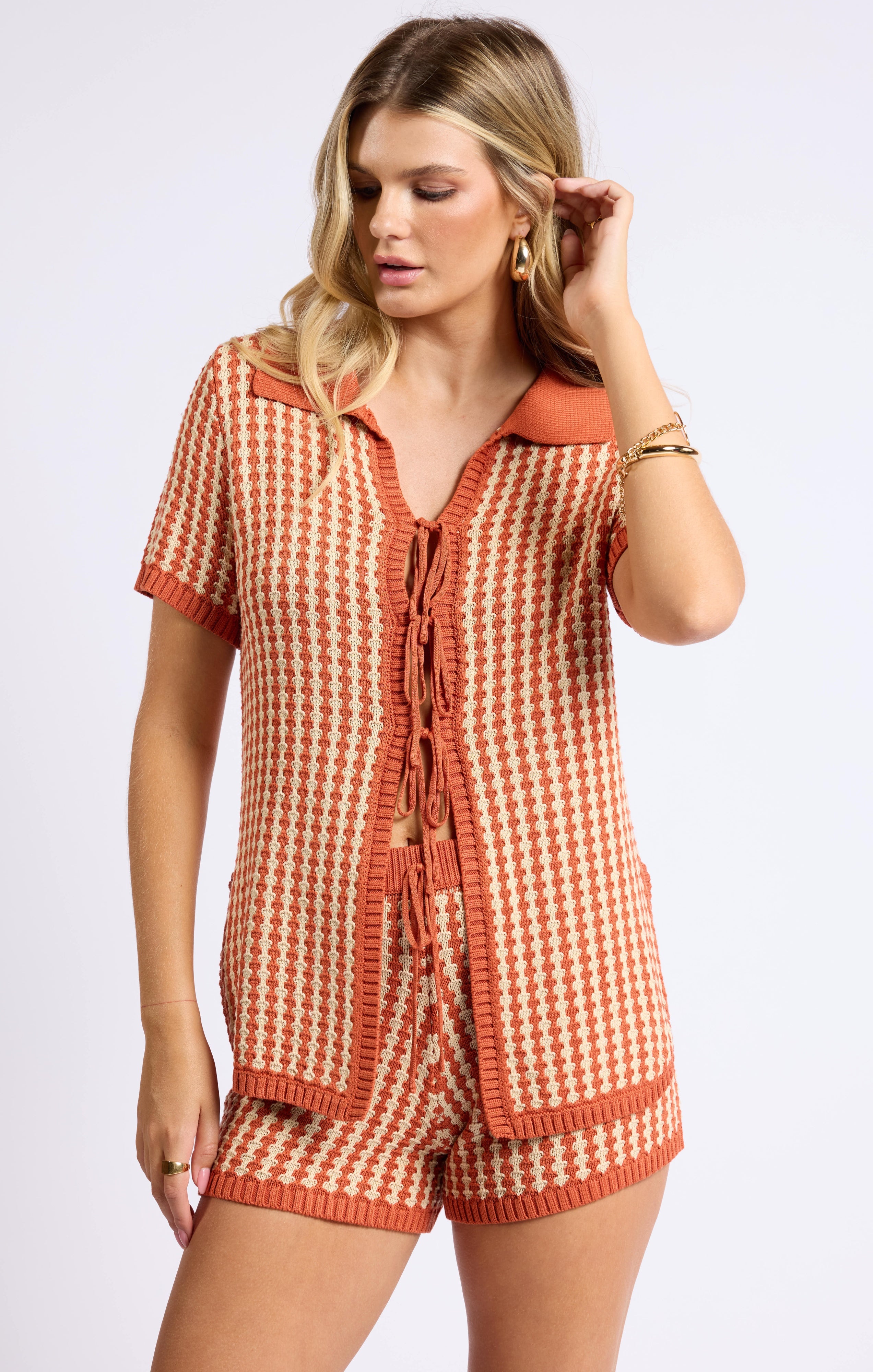 In search of a top that effortlessly transitions from day to night? Look no further than the Dark Orange/Natural Through The Canyons Sweater Top by Sage The Label. Featuring front ties and short-sleeves, this 100% Rayon top is the perfect addition to your wardrobe.