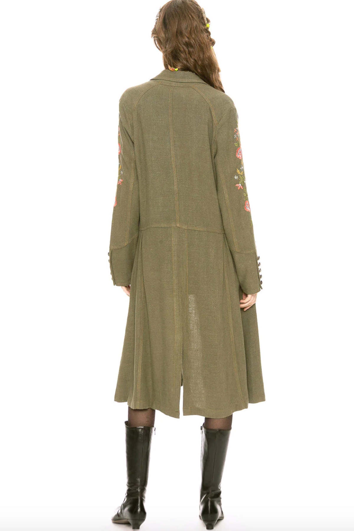 Incredible, show stopping coat from Aratta. This coat is a unique, one-of-a-kind, like no other gem! Coat features two front flap pockets, floral embroidered sleeves and a back hem slit. Materials - Materials: 100% ramie - Care Instructions: dry clean only Sizing For a Size Small - Bust = 35, Waist = 28