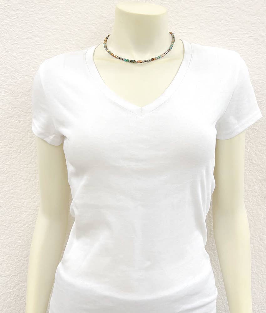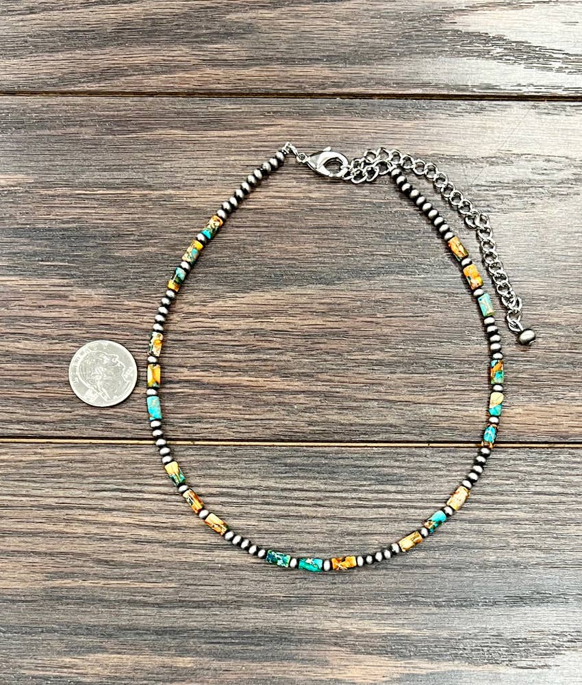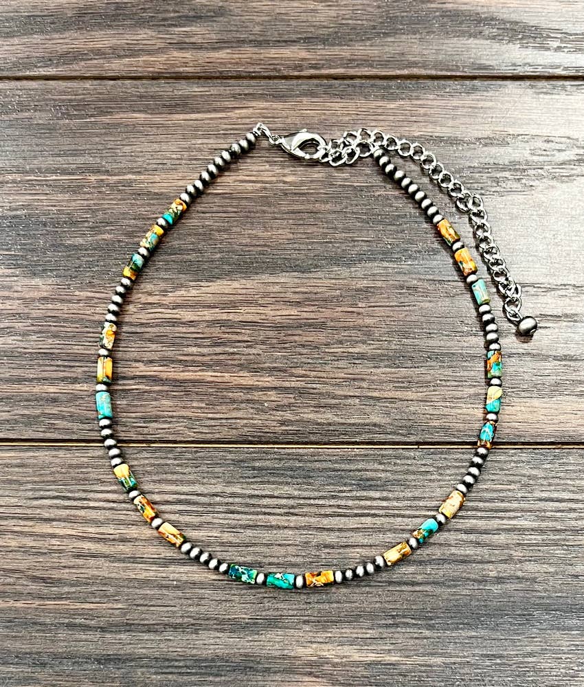 Introducing the Arizona—your new go-to necklace for adding a pop of personality to any outfit! This handcrafted beauty stretches from 16" to 21" thanks to its handy 5" extender, so you can rock it however you like. Featuring a gorgeous mix of 8mm cylindrical gemstones and delicate 4mm Navajo beads, each piece is totally one-of-a-kind since natural stones love to keep things interesting with their unique colors and shapes. Weighing just 15 grams, it's light enough to wear all day without a second thought. Plus, it's nickel, lead, and chrome-free—because your skin deserves the good stuff!