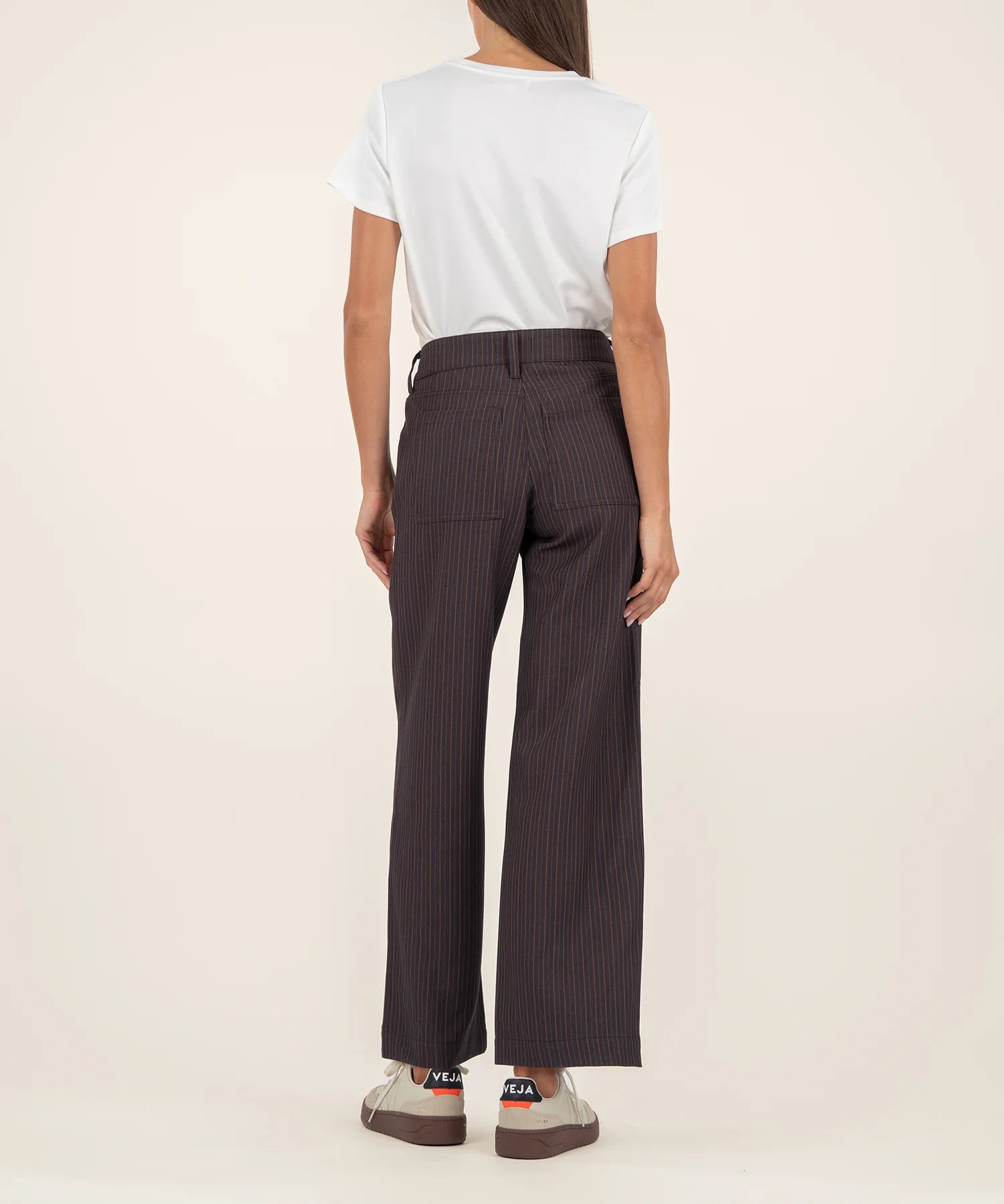- Elevate your look with these high-rise wide-leg pants in a rich chocolate color, featuring subtle stripes for a touch of sophistication and timeless style.