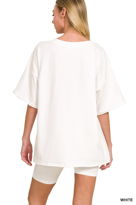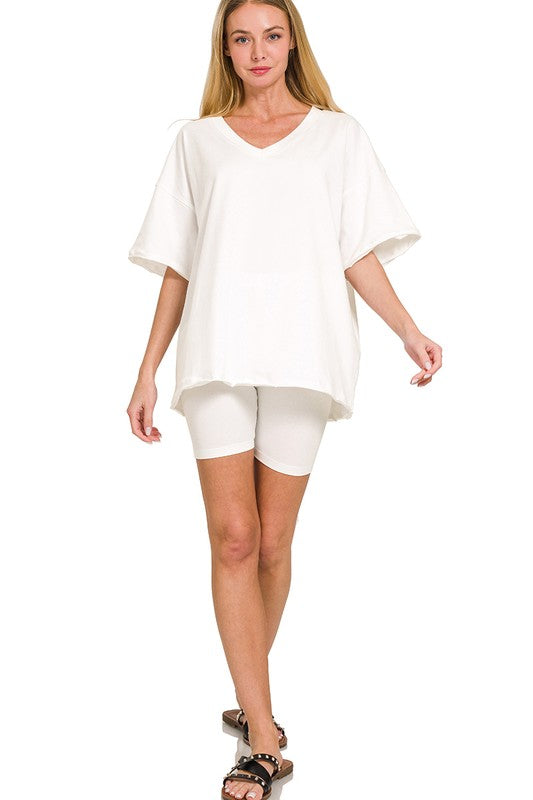 Get ready to lounge or move in style with this playful Cotton V-Neck Top & Biker Shorts Set! The V-neck raglan sleeve top features a trendy raw edge and measures about 28" in length and 49" around the bust (size small). The matching biker shorts have a comfy 22" waist and a 6.75" inseam. Made from a soft blend of 95% cotton and 5% spandex, this set offers just the right stretch. Colors might look a bit different depending on your screen, adding a little surprise to your wardrobe!