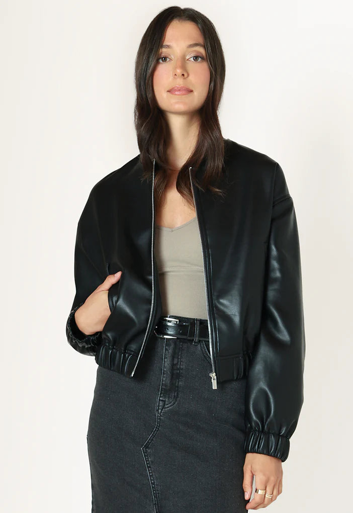 Faux leather bomber, zip front, elastic waist and cuffs