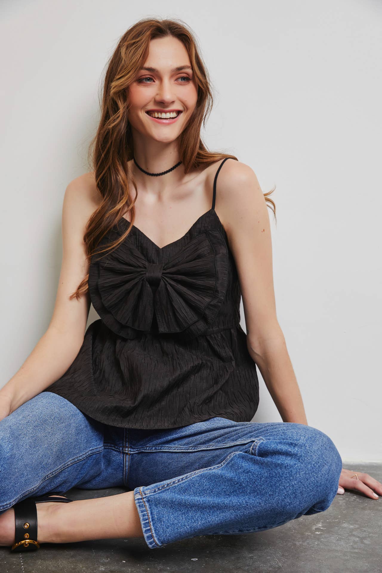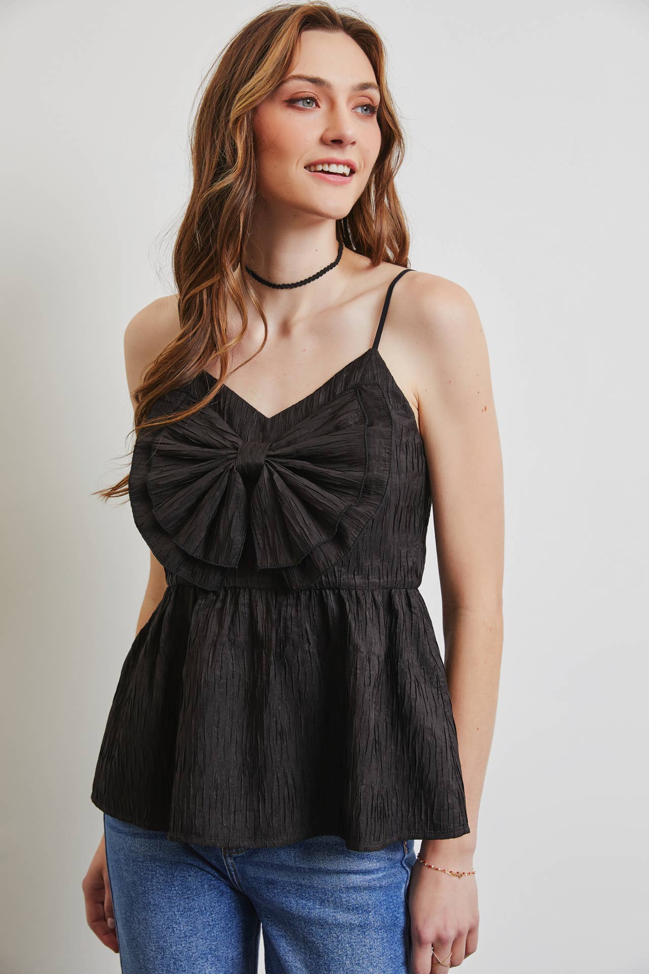 STUN IN THIS ULTRA-STUNNING TEXTURED JACQUARD BABYDOLL TANK TOP WITH GIANT BOW AND BACK ZIPPER CLOSURE