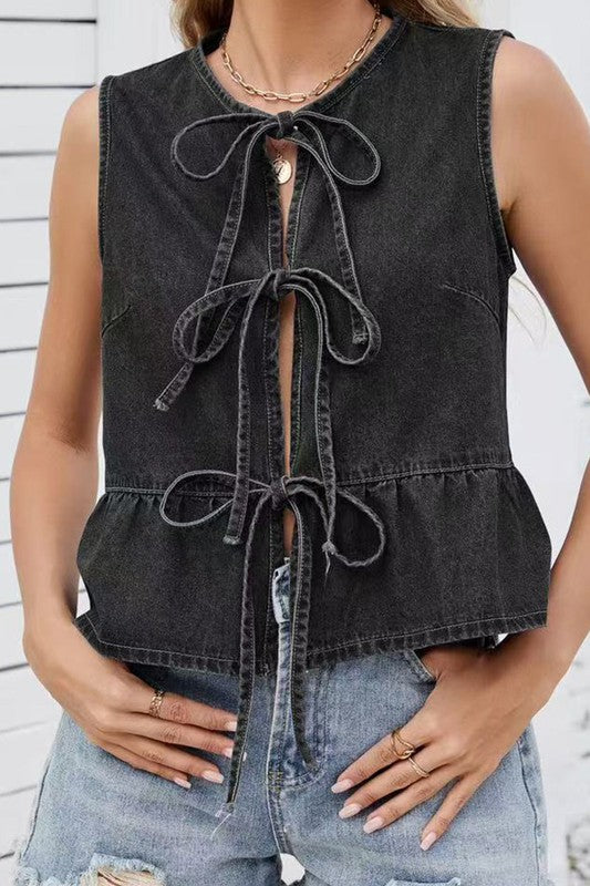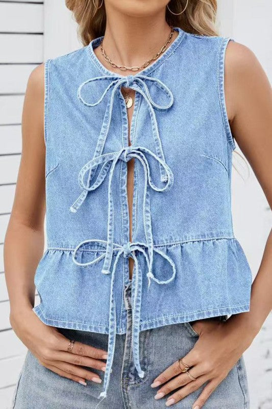 Elevate your warm-weather rotation with this charming denim essential. Adorable bow-tie details trace the front placket, while a playful peplum hem adds movement and curves to your silhouette. The sleeveless cut keeps things breezy and versatile—pair it with denim shorts for a classic look, style it over a lightweight tee for layered interest, or dress it up with a skirt for instant polish. A spirited piece that transforms any casual day into something special.