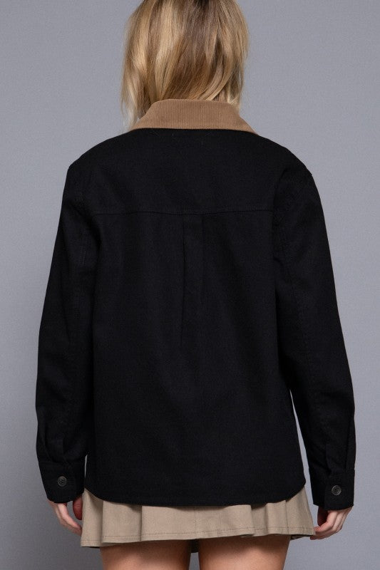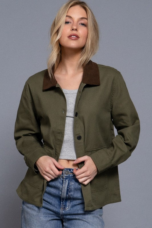 This long sleeve work jacket brings a fun twist to classic style with its charming corduroy collar detail. Crafted from 100% cotton twill, it offers durability and comfort for all your busy days. Whether you're tackling projects or just out and about, this jacket keeps you cozy while adding a touch of playful flair to your look. Perfect for those who love practical fashion with a little personality!