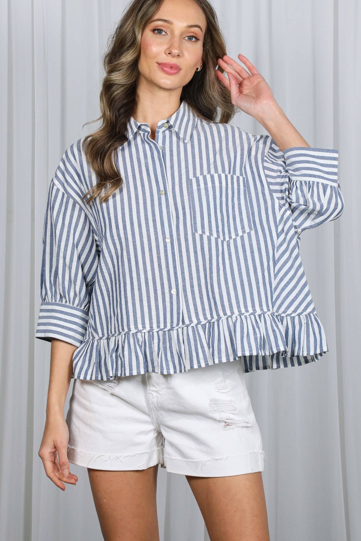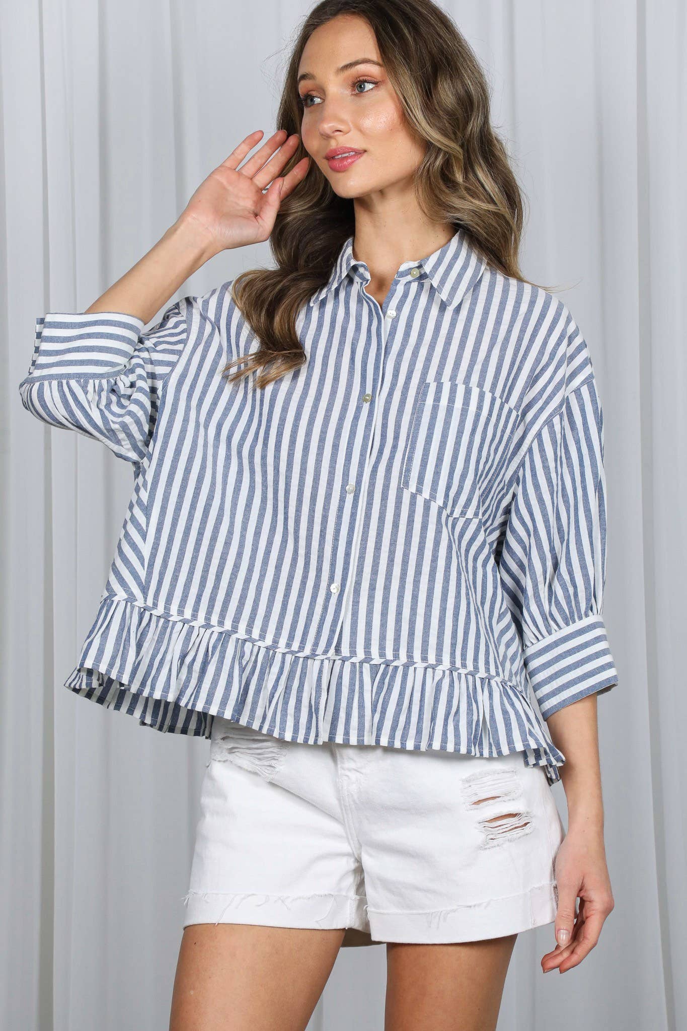 Meet the Sloan—your new go-to for effortless style that works everywhere. This striped cotton blouse features a charming lapel collar, cropped button front, and playful peplum ruffle hem that adds just the right amount of flair. The relaxed drop shoulders and three-quarter puff sleeves with buttoned cuffs give it that breezy, laid-back vibe, while the back yoke detail keeps things interesting. Soft, breathable, and surprisingly versatile—dress it up for the office or keep it casual for weekend adventures. Chest patch pocket included. Model is 5'8" wearing a Small.